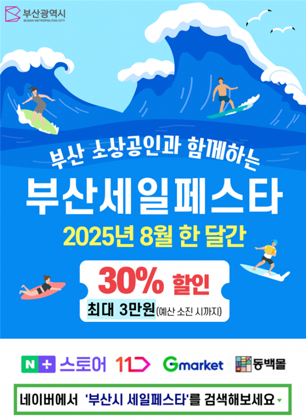 [충청뉴스큐] 부산시는 8월 한 달간 국내 주요 온라인몰인 △네이버 △11번가 △지마켓 △동백몰에서 ‘부산세일페스타’ 특별할인전으로 30퍼센트 할인 쿠폰을 제공한다고 밝혔다.