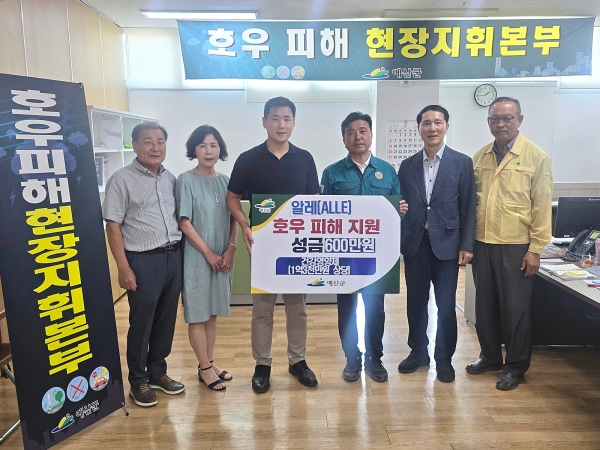[충청뉴스큐] 예산군은 건강기능식품 판매업체 알레의 김시황 대표가 최근 집중호우로 피해를 입은 이재민을 위해 건강기능식품 7종 1만3000개와 성금 600만원을 기탁했다고 밝혔다.