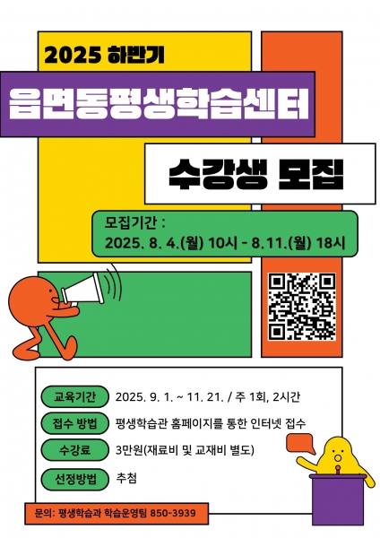 하정숙 평생학습과장은 “읍면동 평생학습센터는 지역 주민 누구나 근거리에서 배움을 누릴 수 있도록 마련된 생활 속 학습 공간”이라며 “이번 하반기 프로그램을 통해 시민들이 자신의 관심사와 재능을 키우고 지역사회와 소통하는 기회가 되기를 기대한다”고 전했다.