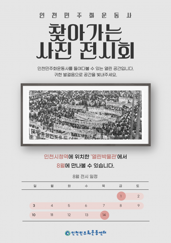 [충청뉴스큐] 인천광역시 시립박물관은 8월 1일부터 8월 14일까지 인천지하철 1호선 인천시청역 내 ‘열린박물관’에서 대관전시 ‘인천민주화운동사 찾아가는 사진 전시회’를 개최한다고 밝혔다.