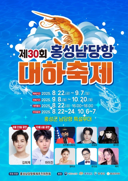 김용태 축제추진위원장은 “올해로 30주년을 맞이하는 남당항 대하축제는 맛과 체험, 힐링이 함께하는 축제”며 “남당항에서 대하의 참맛과 다양한 무대와 공연, 체험을 통해 오시는 분들이 행복한 추억을 담아가시길 바란다”고 말했다.