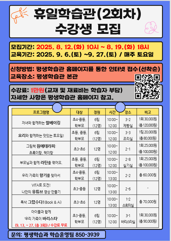 자녀와 부모가 함께 참여할 수 있는 체험 중심 강좌로 구성되어 단순한 지식 전달을 넘어 가족 간의 공감과 협력을 실천하는 평생학습의 장이 될 것으로 기대된다.