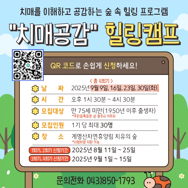 [충청뉴스큐] 충주시 치매안심센터는 치매에 대한 인식 개선과 주민 공감대 형성을 위해 오는 9월 계명산자연휴양림 치유의 숲에서 ‘치매 원데이 힐링캠프’를 운영한다고 밝혔다.