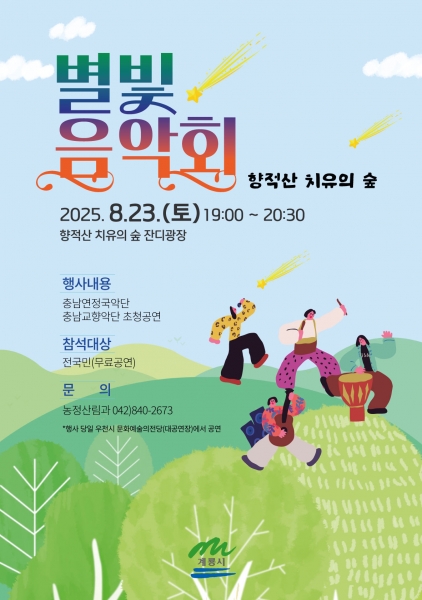 [충청뉴스큐] 계룡시는 오는 23일 오후 7시부터 8시 30분까지 향적산 치유의 숲 잔디광장에서 ‘향적산 치유의 숲 별빛음악회’를 개최한다고 밝혔다.