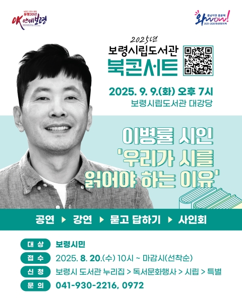 [충청뉴스큐] 보령시는 9월 9일 오후 7시 보령시립도서관 대강당에서 보령시민을 대상으로 이병률 시인 북콘서트를 개최한다고 밝혔다.