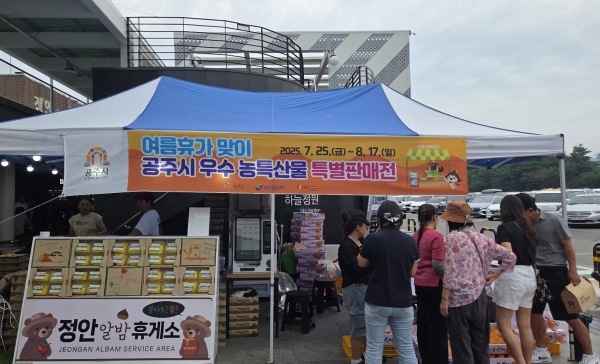 [충청뉴스큐] 공주시는 여름 휴가철을 맞아 정안알밤휴게소 상·하행선 야외 판매장에서 열린 ‘2025년 여름휴가철 지역 농·특산물 홍보판촉전’ 이 성황리에 마무리됐다고 19일 밝혔다.