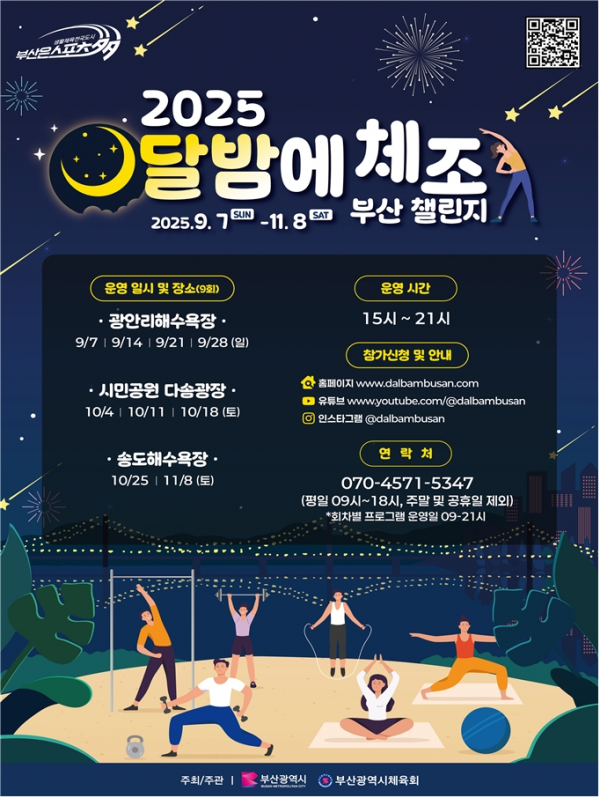 프로그램 참가는 오는 8월 22일부터 1회차 프로그램 접수를 시작으로 '2025 달밤에체조 부산 챌린지' 전용 누리집 또는 '으랏차차 부산 생활체육포털'를 통해 회차별 200명까지 선착순으로 사전 신청이 가능하다.
