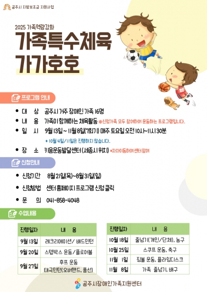 [충청뉴스큐] 공주시장애인가족지원센터는 오는 8월 21일부터 31일까지 공주시에 거주하는 장애인 가족을 대상으로 가족 체육 활동 프로그램 ‘가가호호’ 참여자를 모집한다고 20일 밝혔다.