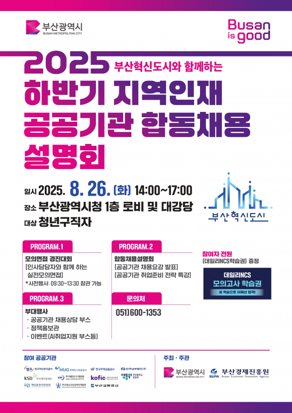 [충청뉴스큐] 부산시는 내일 오후 2시 시청 대강당에서 부산 혁신도시와 함께하는 ‘2025 하반기 지역인재 공공기관 합동채용설명회’를 개최한다고 밝혔다.