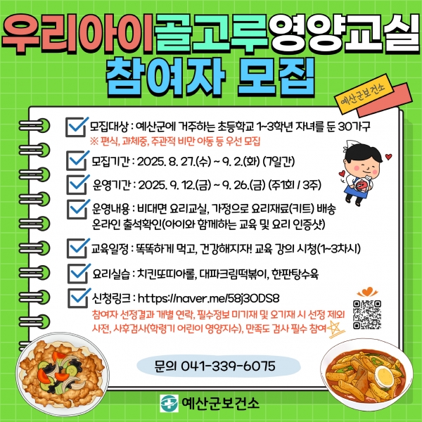 [충청뉴스큐] 예산군보건소는 성장기 아동의 올바른 식습관 형성을 돕기 위해 오는 9월 3주간 ‘우리아이 골고루 영양교실’을 운영한다.