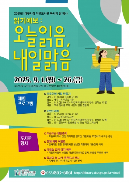 [충청뉴스큐] 대구광역시청 작은도서관은 9월 ‘독서의 달’을 맞아, 9월 1일부터 26일까지 4주간 ‘읽기예보: 오늘읽음, 내일맑음’ 이라는 주제로 시민을 위한 다양한 독서문화 행사를 운영한다.