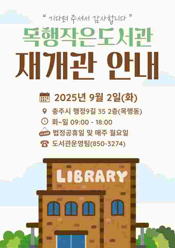 [충청뉴스큐] 충주시는 목행작은도서관이 8개월간의 리모델링 공사를 마치고 오는 9월 2일 새롭게 개관한다고 밝혔다.
