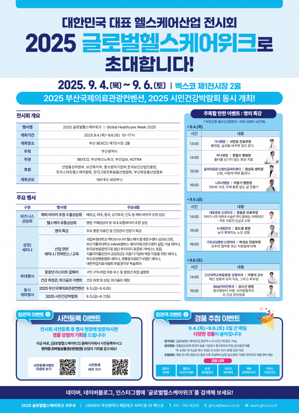 [충청뉴스큐] 부산시는 오는 4일부터 6일까지 벡스코 제1전시장에서 △복지 재활 △항노화 △화장품 산업의 발전과 △해외 시장 개척을 위한 ‘2025 글로벌 헬스케어 위크’를 개최한다고 밝혔다.
