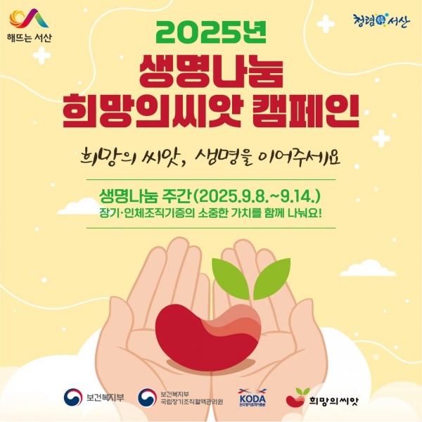 [충청뉴스큐] 충남 서산시가 9월 9일 장기기증의 날 기념 생명나눔 주간을 맞아 8일부터 14일까지 생명나눔 희망의 씨앗 캠페인을 운영한다.