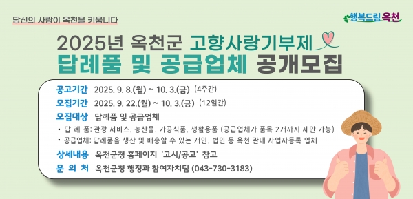 [충청뉴스큐] 옥천군이 8일부터 한 달 동안 고향사랑기부제 답례품 및 공급업체 추가 모집한다.