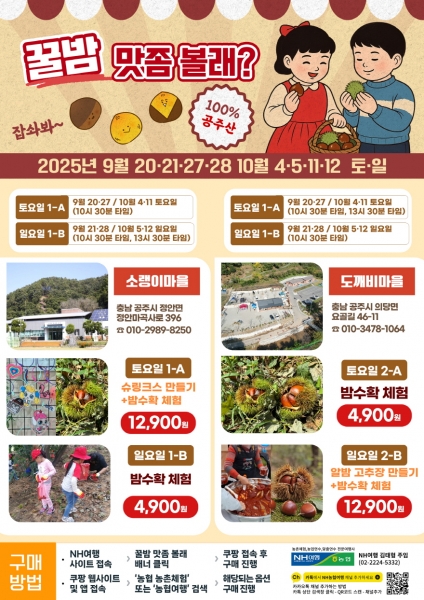 [충청뉴스큐] 공주시는 농협네트웍스와 협력해 농촌과 도시의 교류를 넓히고 지역 경제 활성화를 도모하는 ‘밤 줍기 체험 프로그램’을 오는 9월 20일부터 10월 12일까지 운영한다.