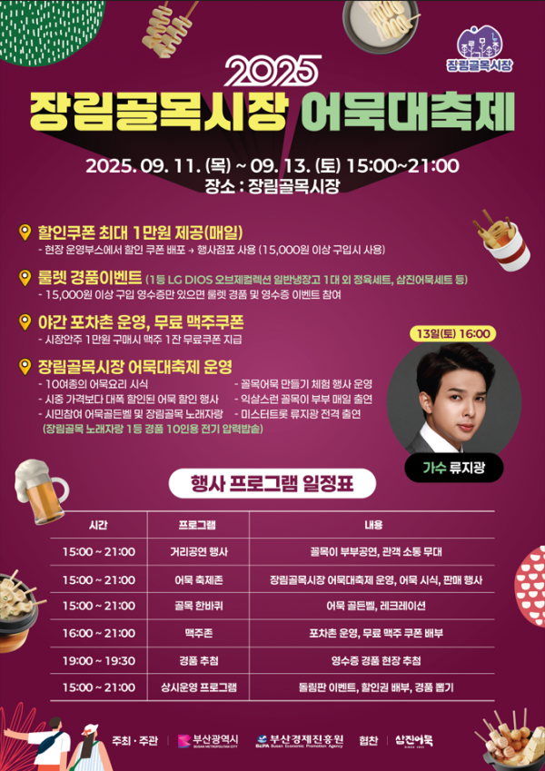 행사 기간 △어묵 요리 시식과 어묵 만들기 체험 △매일 최대 1만원 할인쿠폰 배포 △경품 이벤트 △시원한 맥주를 즐길 수 있는 야간 포차촌 △유명 초청 가수 공연 등 방문객을 위한 다양한 프로그램이 진행된다.
