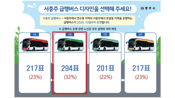 시는 지난 8월 19일부터 24일까지 서충주 도서관 등 3개소에서 급행버스 디자인 시민 선호도 조사를 실시해 디자인을 최종 결정했다.