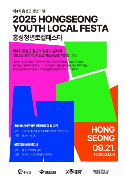 [충청뉴스큐] 홍성군은 법정기념일인 청년의 날을 맞아 오는 21일 오후 1시부터 오후 9시까지 군청 여하정 일원에서 ‘제4회 홍성 청년의 날 – 홍성청년 로컬페스타’를 개최한다고 밝혔다.