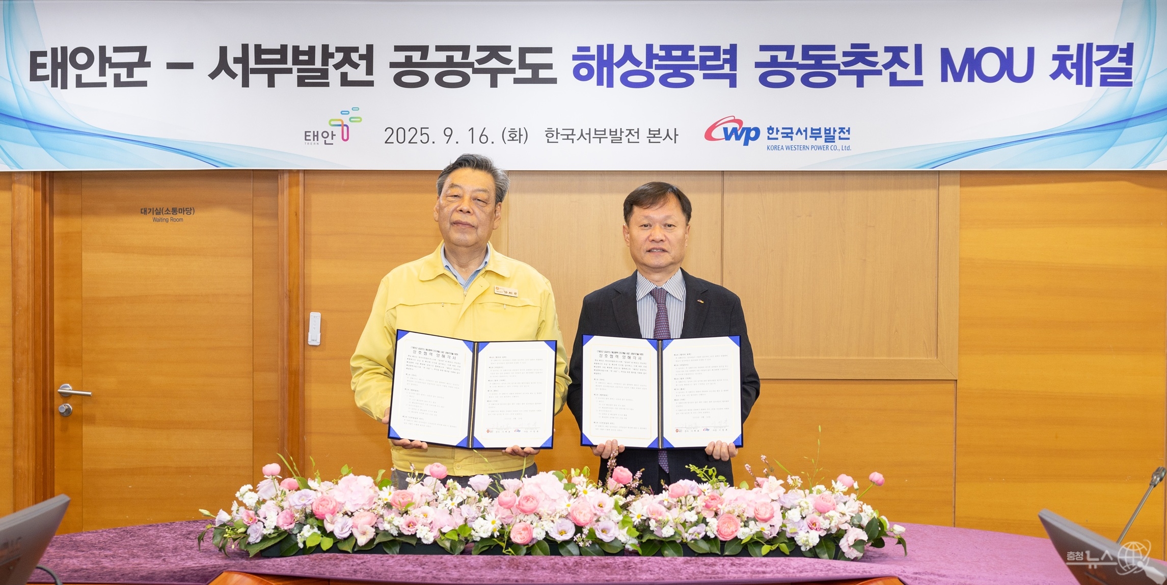 서부발전은 16일 충남 태안 본사에서 태안군과 ‘태안군 내 공공주도 해상풍력 단지개발 사업 공동 추진을 위한 양해각서(MOU)’에 서명했다. 서명식에는 이정복 서부발전 사장과 가세로 태안군수 등 두 기관 관계자 10여 명이 참석했다.