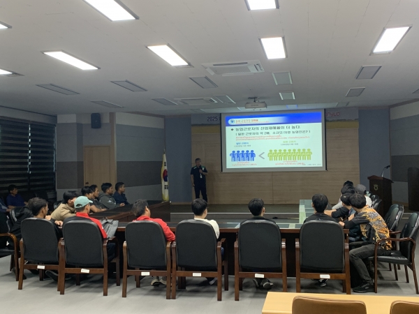 이번 교육은 농업 현장에서 발생할 수 있는 안전사고를 예방하고 외국인 근로자의 안전의식을 높이기 위해 마련됐으며 교육에는 박찬규 농작업안전관리관이 강사로 참여해 농작업 안전의 기본 개념과 이해, 농작업 5대 기본수칙 등을 중심으로 강의와 사례 설명을 진행했다.