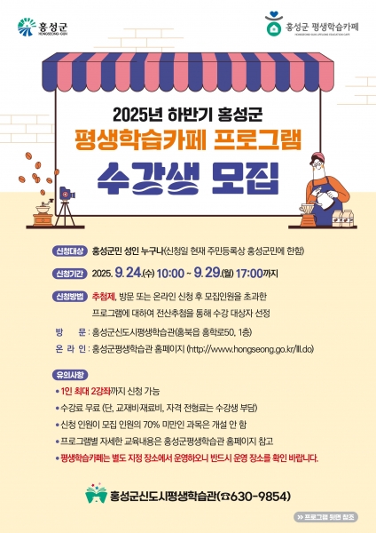 [충청뉴스큐] 홍성군은 오는 24일부터 29일까지 4일간 평생학습 저변 확대를 위한 하반기 평생학습카페 프로그램 수강생을 모집한다.