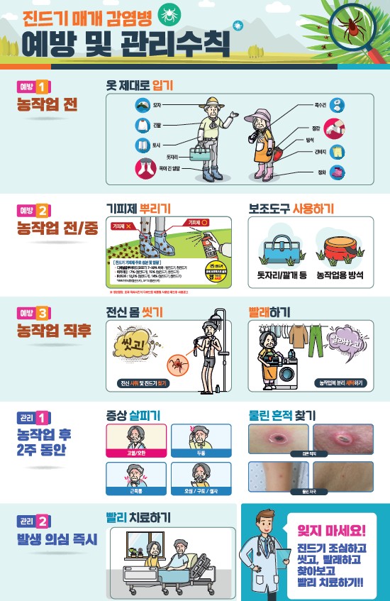 또한 △외출 후에는 옷을 꼼꼼히 털고 바로 샤워하며 진드기를 제거 △ 풀밭 위에 옷을 벗어 놓거나 눕지 않아야 하며 야외활동 후 2주 이내에 고열, 두통, 오한 등 의심 증상이 나타나면 즉시 의료기관을 방문해 진료받아야 한다.