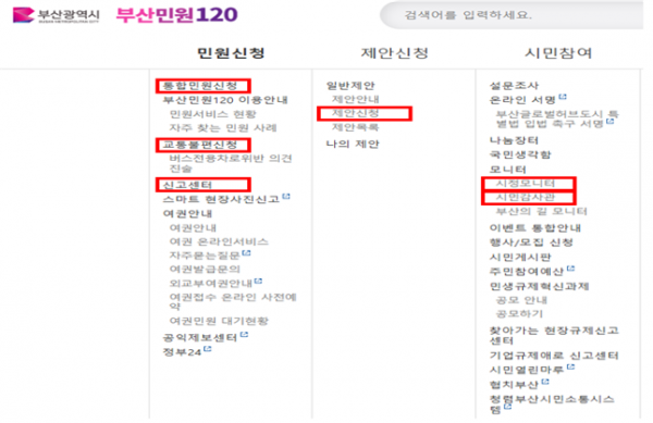 또한 △‘소방재난본부 민원상담’과 △‘상수도사업본부 시민참여’ 창구도 함께 운영되어 각 분야별로 민원을 온라인으로 접수하고 처리 결과를 확인할 수 있다.