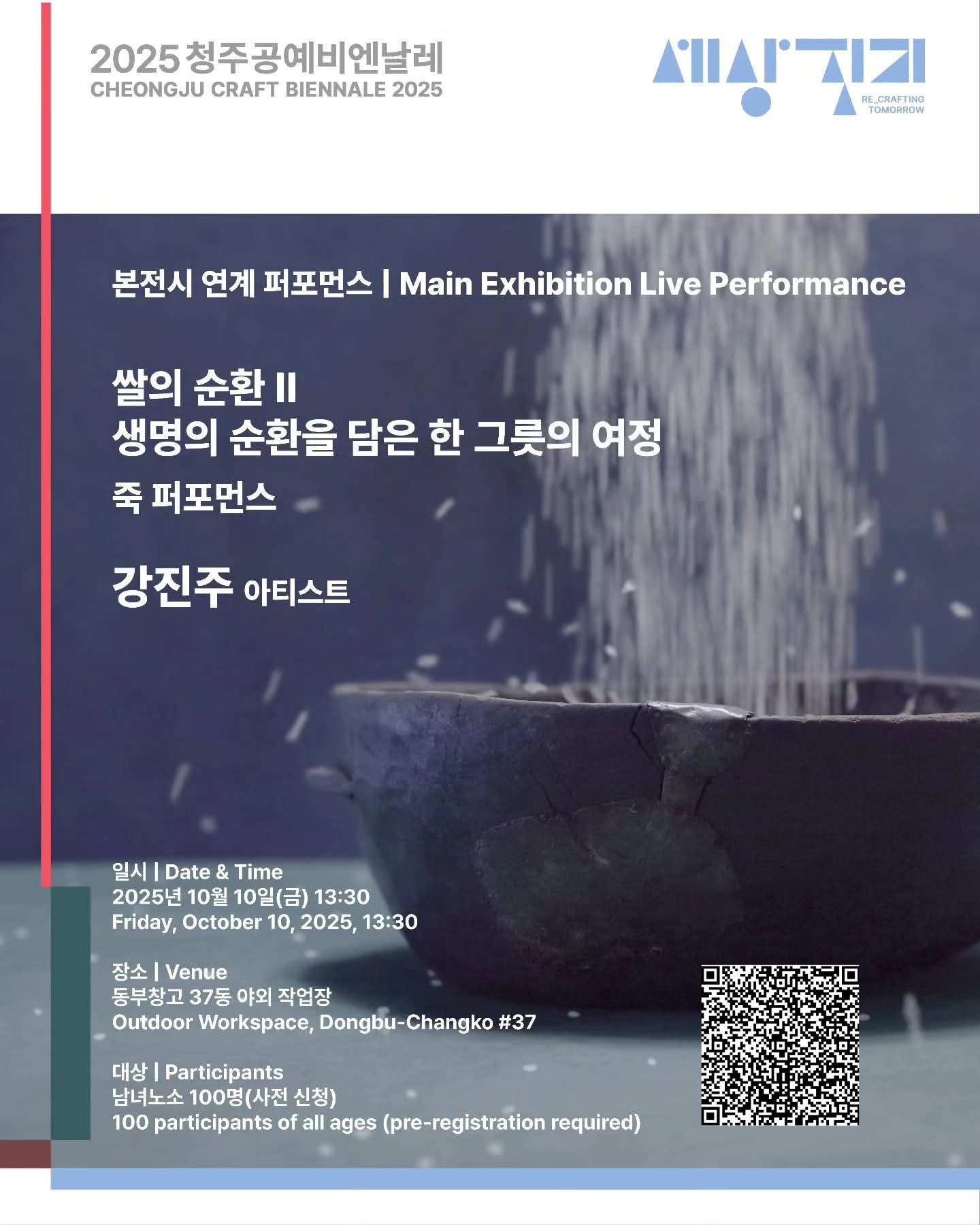 우선 오는 10일 문화제조창 동부창고 37동 야외 작업장에서 오후 1시 30분부터 30분 간격으로 오후 3시까지 네 차례 진행하는 ‘밥 짓기 – 쌀의 순환 2’가 총 100명까지 선착순으로 참여자를 모집한다. 지난 3일(금) 선재 스님과 ‘밥 짓기 프로젝트’를 진행한 본전시 참여작가 강진주의 두 번째 퍼포먼스로, 우리 쌀로 직접 쑨 죽을 나누며 생명의 순환과 치유의 여정을 함께하는 자리다. 신청링크(╨https://docs.google.com/forms/d/e/1FAIpQLSeRxXZaBrwf4veWS5jWIRg92m_h9lU7BlpNOBwd3DmBKGZWNg/viewformh)를 통해 신청자를 모집하며, 모집 상황에 따라 현장 접수도 진행할 수 있다.