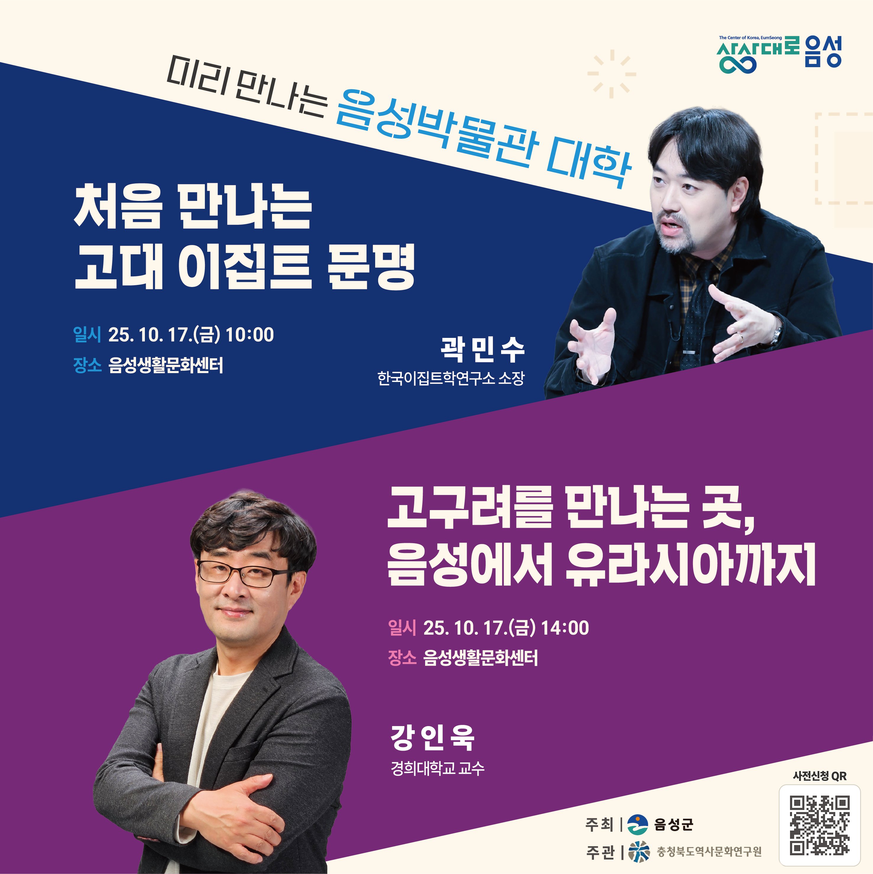 방송과 온라인에서 활발하게 활동하며 ‘애굽민수’라는 애칭으로 잘 알려진 국내 최고 이집트 고고학자 곽민수 한국이집트학연구소장과 경희대학교 사학과 교수이자 한국 고대사 고고학 연구소장인 강인욱 교수를 초청해 음성군과 이집트 및 유라시아 문화에 관한 연관성에 대해 강의할 예정이다.