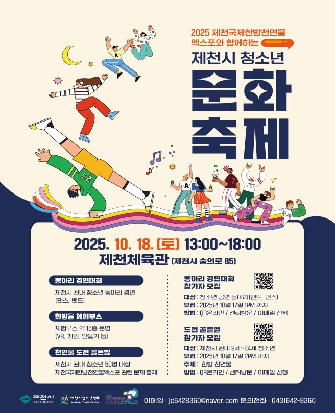 축제 현장에서는 △15개의 체험부스(MBTI 향수 만들기, 커피박 키링 만들기 등) △청소년동아리 공연 △“2025 제천국제 한방 천연물산업엑스포”와 연계된 문제로 진행하는 도전 골든벨 등 다양한 프로그램이 운영될 예정이다.