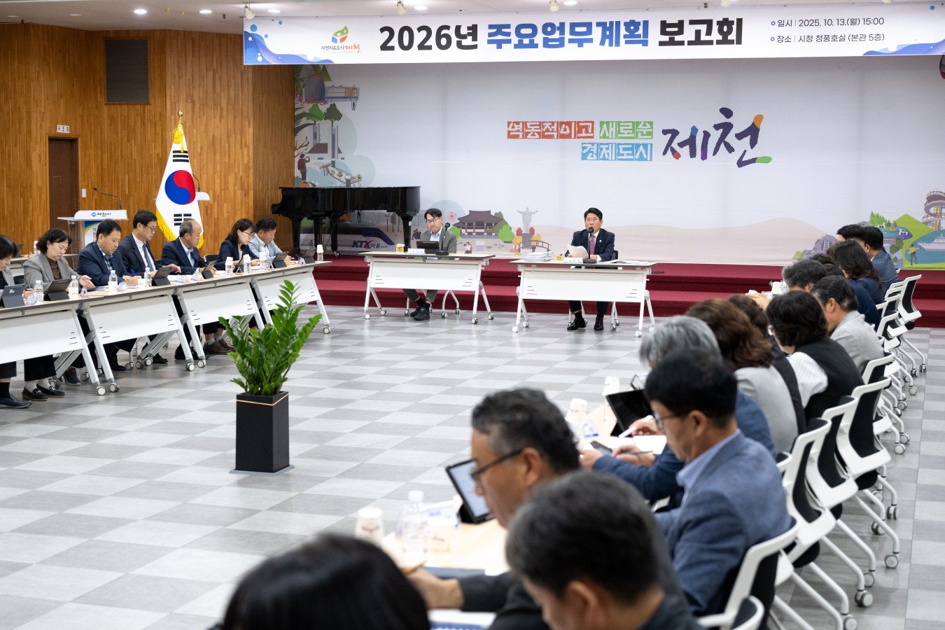 [충청뉴스큐] 제천시는 지난 13일 시청 청풍호실에서 김창규 시장 주재로 국장 및 직속기관장, 부서장이 참석한 가운데 2026년 주요업무계획 보고회를 개최했다.