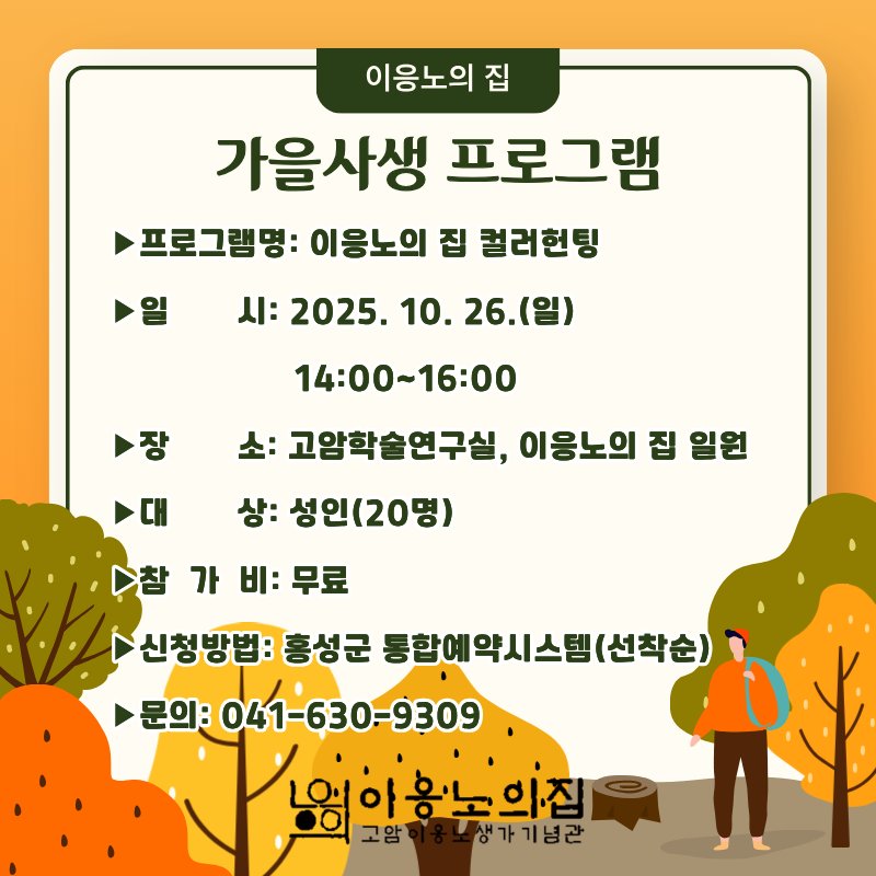 [충청뉴스큐] 홍성군 고암이응노생가기념관(이하 이응노의 집)은 오는 26일(일) 오후 2시부터 4시까지, ‘가을사생 프로그램’을 운영한다고 밝혔다.
