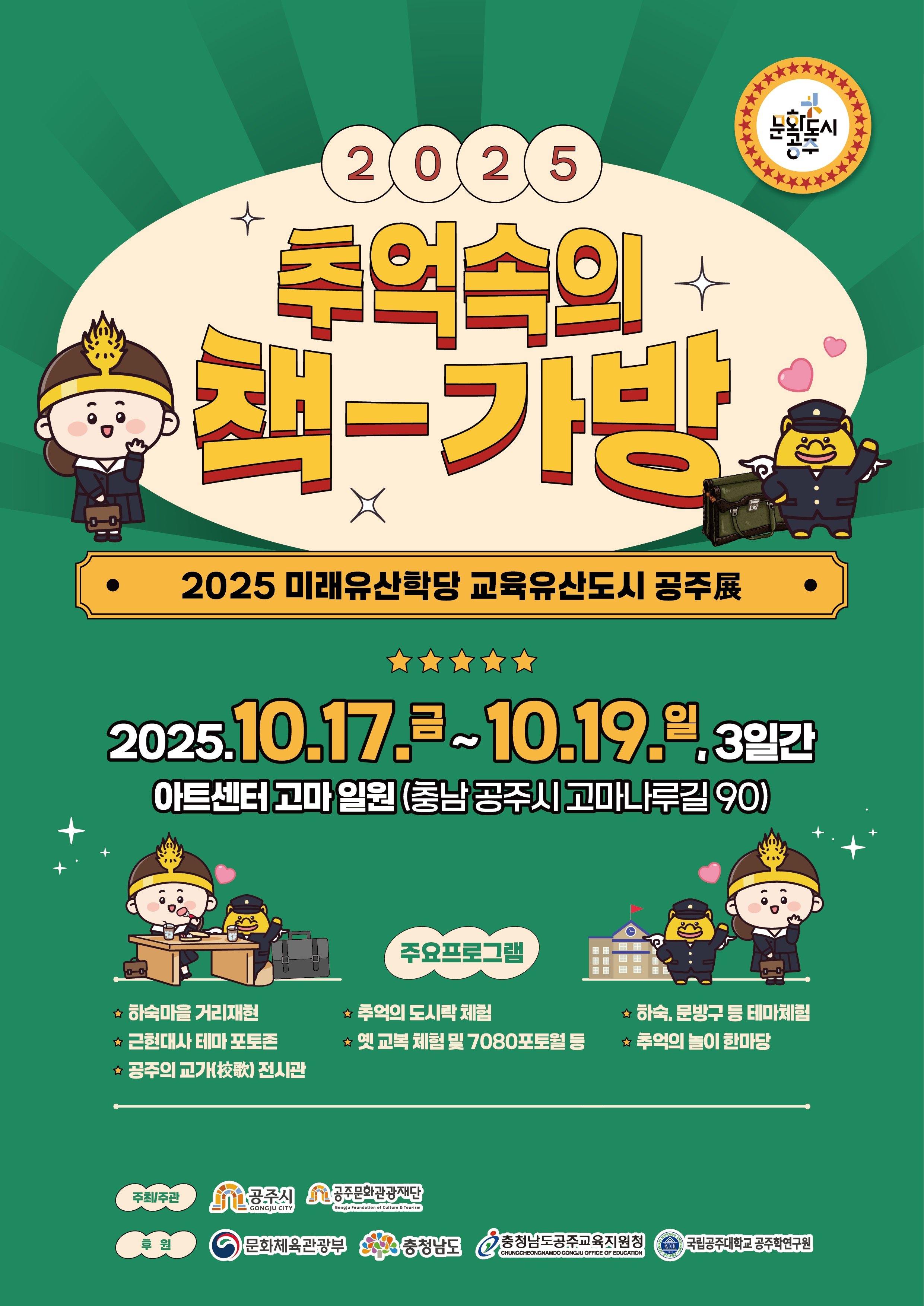 이번 ‘2025 추억 속의 책가방’ 행사는 10월 17일(금)부터 19일(일)까지 공주 아트센터고마에서 개최되며 남녀노소 모든 세대가 함께 추억을 나누고 공감할 수 있는 특별한 시간이 될 것으로 기대한다.