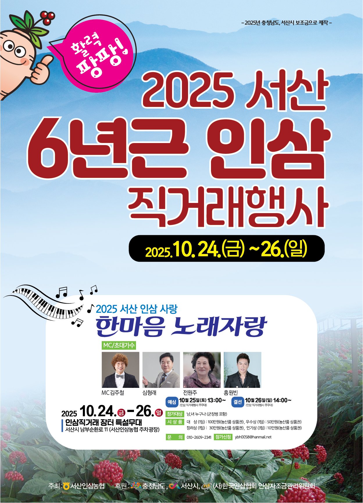 이번 직거래 행사는 서산인삼농협조합(조합장 박종범)에서 주최하며 방문객은 농가가 정성껏 재배한 신선한 6년근 인삼을 시중가 대비 20~30% 저렴하게 구매할 수 있다.