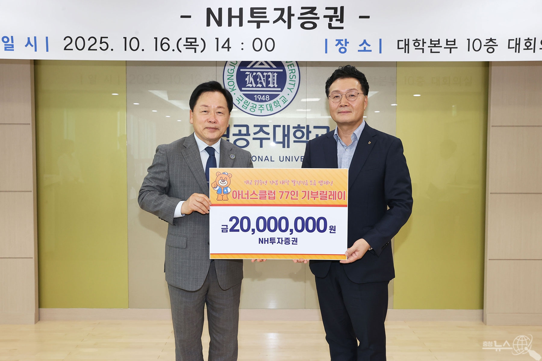 기탁식은 임경호 총장, 박창수 교학부총장, 김병수 사무국장 등 주요 보직자와 NH투자증권 조영래 중서부본부장, 김용규 대전금융3센터장, 송은섭 세종브랜치 점장이 참석한 가운데 진행되었다. NH투자증권은 국립공주대학교 발전기금으로 2,000만원을 기탁하여, 개교 77주년 기념 아너스클럽 77인 기부릴레이의 41번째 주자로 이름을 올렸다.