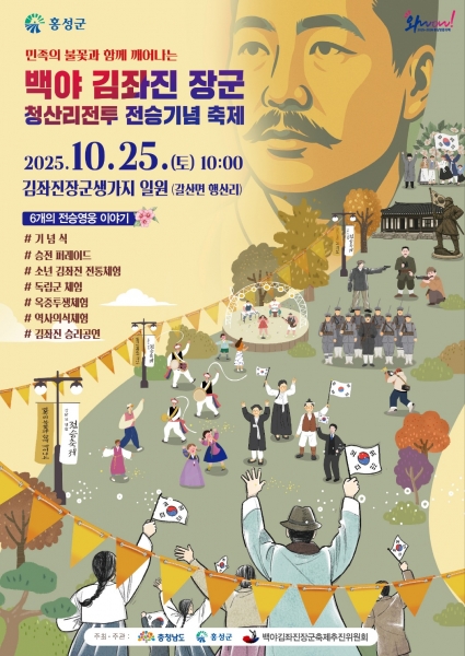 오는 25일 열리는 백야 김좌진 장군 청산리 전승기념 축제는 갈산면 행산리 김좌진 장군 생가 일원에서 개최되며 청산리 전투 퍼레이드, 헌화·분향, 공연, 역사 체험 프로그램 등 세대와 계층을 아우르는 다채로운 프로그램이 운영될 예정이다.