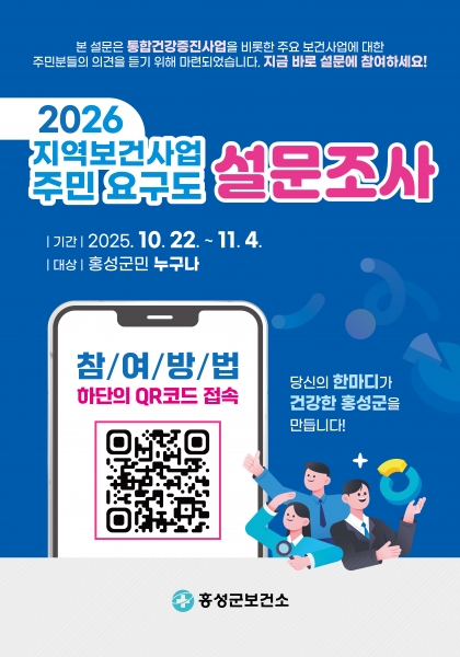 [충청뉴스큐] 홍성군보건소는 주민들의 건강 수요를 반영한 보건정책 추진을 위해 ‘지역보건사업 주민 요구도 설문조사’를 오는 22일부터 2주간 실시한다고 밝혔다.