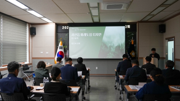 괴산읍 미래도심 디자인 연구회는 괴산읍의 도시공간 구조를 재정비하고 지역의 정체성과 미래 성장 동력을 반영한 도심 디자인 방향을 모색하고자 하는 연구 단체로 이번 보고에서 사업 대상지의 공간분석 결과와 함께 기본구상 방향과 운영 계획을 제시하며 주민 중심의 공간재생 전략과 디자인 컨셉을 소개했다.