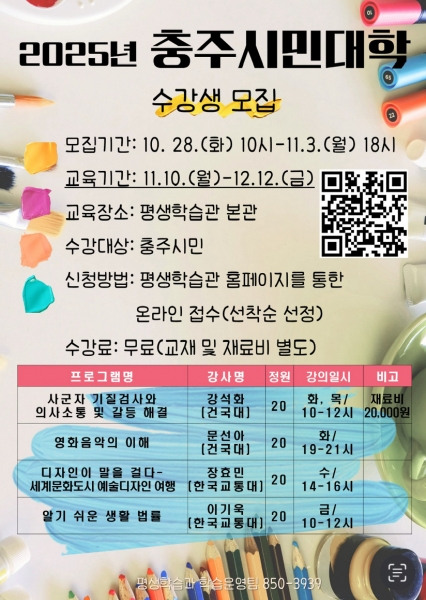 [충청뉴스큐] 충주시가 지역대학과 협력해 추진하는 ‘2025년 충주시민대학’의 수강생을 모집한다고 밝혔다.