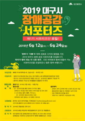 [충청뉴스큐] 대구시는 장애에 대한 올바른 이해와 공감을 확산해 ‘다름’이 차별과 편견의 대상이 아닌 다양한 개성으로 인식되는 더 따뜻하고 열린 도시로 만들어갈 ‘2019 장애공감 서포터즈’를 모집한다.