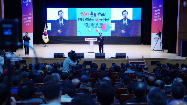 김태흠 충남도지사는 이날 이완섭 서산시장과 함께 시청 중회의실에서 언론인 간담회를 진행한 후 문화회관에서 시민 6백여명과 지역 발전 방안을 공유했다.