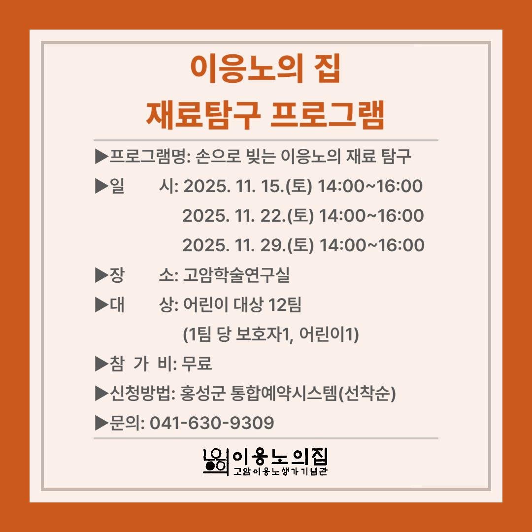 [충청뉴스큐] 홍성군 고암이응노생가기념관은 오는 15일 22일 29일 오후 2시부터 4시까지 ‘재료탐구 프로그램’을 운영한다고 밝혔다.