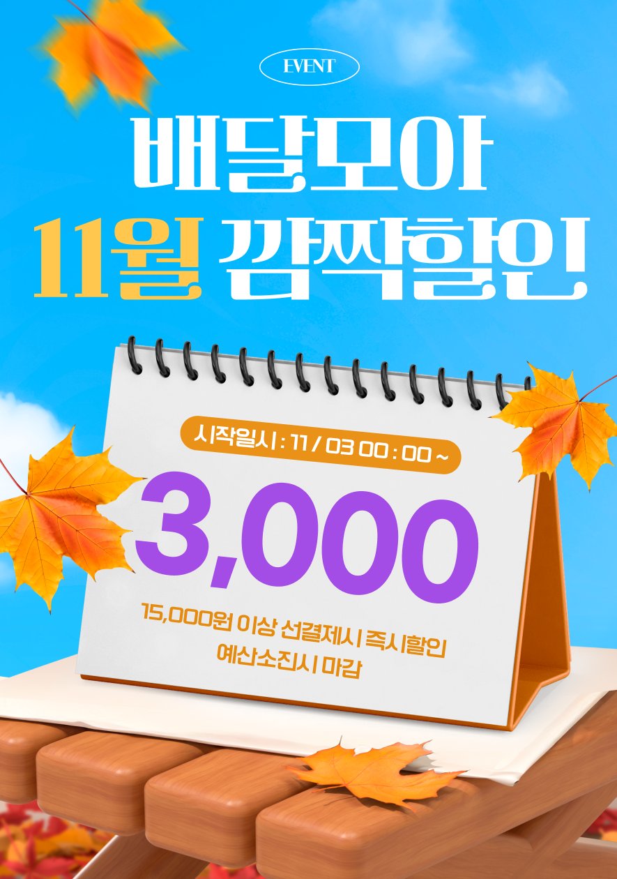 11월에는 3,000원 쿠폰을 선착순으로 1만 장 지급하는 이벤트를 진행한다.