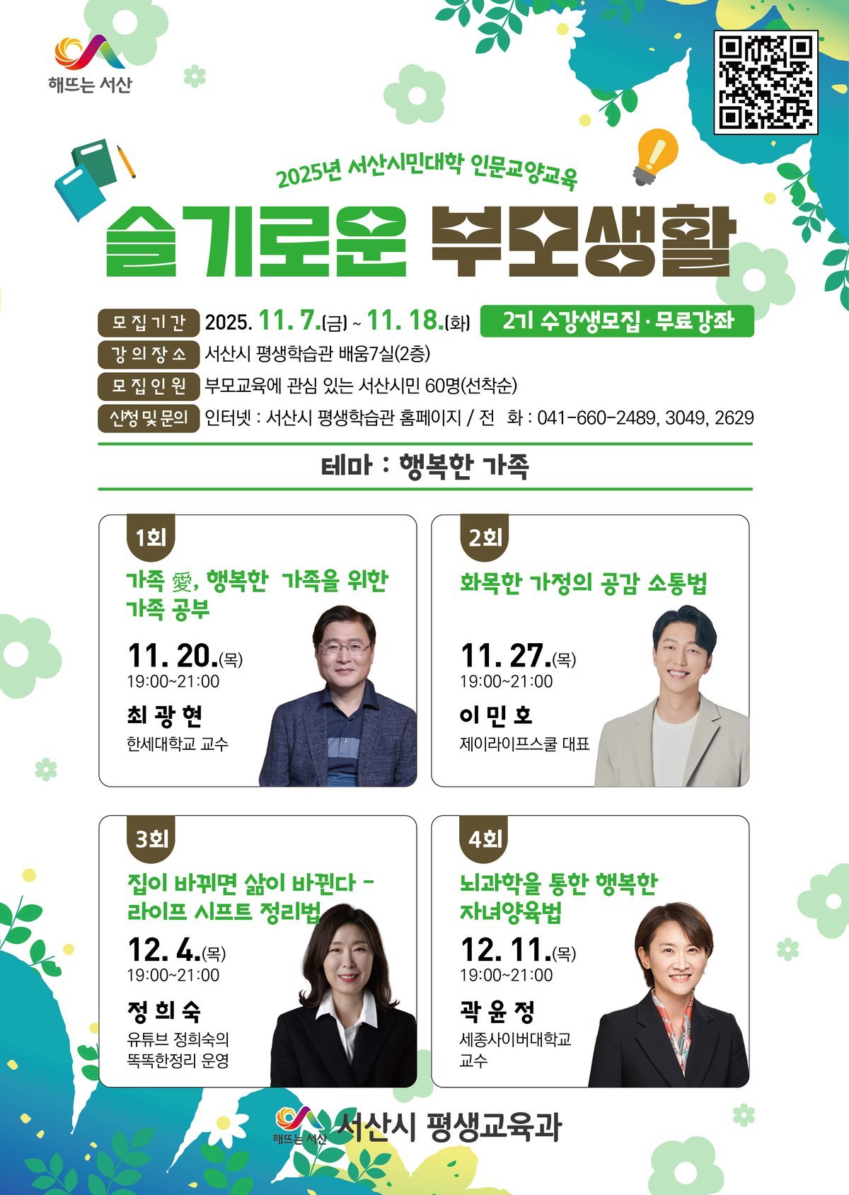 '슬기로운 부모생활'강좌는 11월 20일부터 12월 11일까지 매주 목요일 오후 7시에 서산시평생학습관에서 운영될 예정이다.