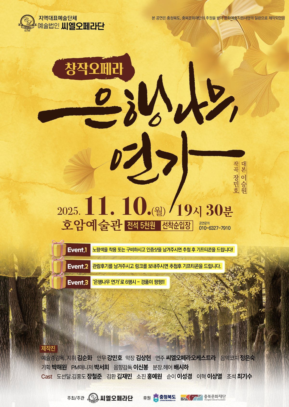 본 작품은 충북문화재단 예술창작활동지원사업 선정작으로 한국의 정서와 아름다운 자연을 상징하는 ‘은행나무’를 배경으로 세대를 초월한 사랑과 추억의 가치를 담아낸 창작 오페라다.