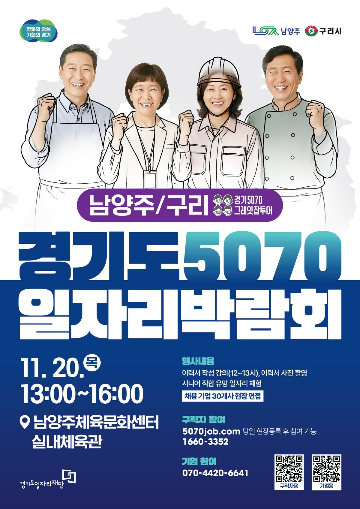 [충청뉴스큐] 경기도와 경기도일자리재단이 11월 20일 남양주체육문화센터에서 ‘경기도 5070 일자리박람회 in 남양주 구리’를 개최한다.