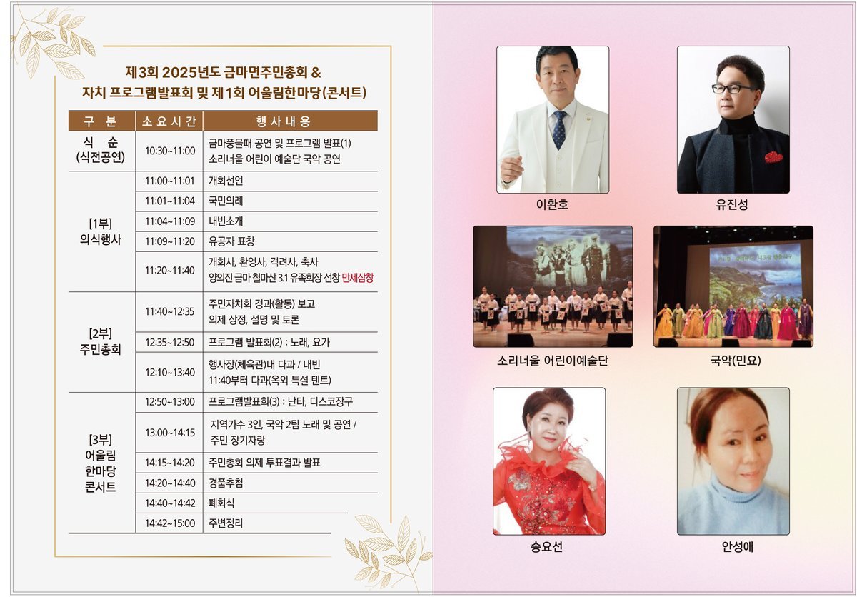 [충청뉴스큐] 홍성군 금마면주민자치회가 주민과 함께 만들어가는 행복마을 제3회 금마면주민총회 및 제1회 어울림한마당 콘서트를 오는 15일 금마초등학교 봉수관에서 개최한다,광복 80주년 및 철마산 3.1독립운동 106주년을 기념해 열리는 이번 금마면 주민총회는 금마 철마산 3.1독립운동 유족회가 올봄 펴낸 ‘실록 철마산 3.1 독립운동사’를 재편집해 수록한 특별한 주민총회 자료집을 발간, 제공함으로써 한국독립운동사에 찬란히 빛나는 선조들의 애국·애족 정신을 일깨워주는 계기로 삼는다는 데에 큰 의의가 있다.