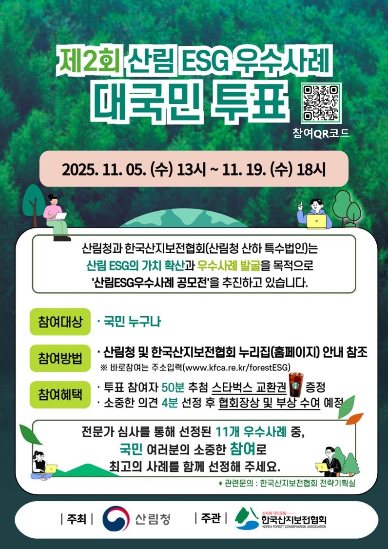 이번 공모전의 대국민 투표는 오는 19일 오후 6시까지 온라인으로 진행되며 한국산지보전협회 홈페이지 내 배너를 통해 참여할 수 있다.