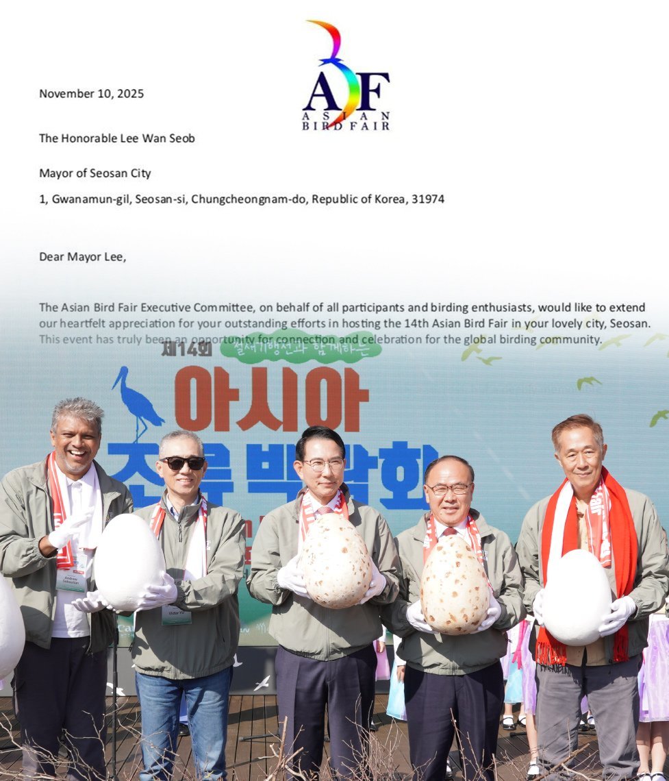 시는 지난 11월 1일부터 2일까지 천수만 일원에서 제14회 아시아 조류박람회를 성공적으로 개최한 가운데, 아시아 조류박람회 집행위원회로부터 감사의 서한을 받았다고 밝혔다.